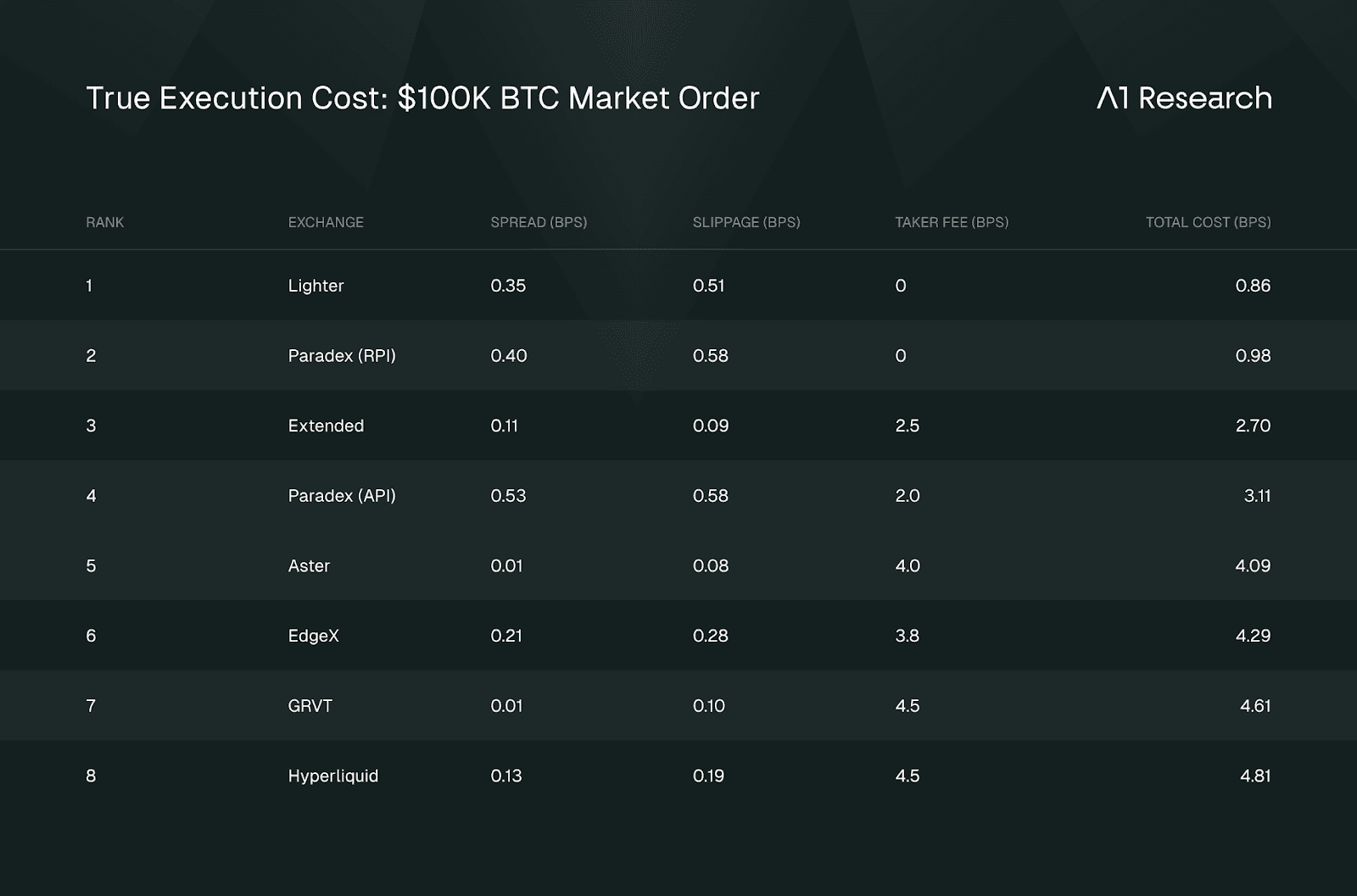 The following table shows fee-adjusted execution costs using BTC-specific data. For Paradex, we include both API and RPI scenarios to illustrate the retail UI advantage: