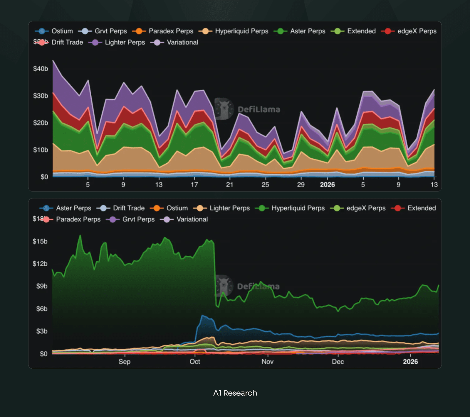 Before examining execution quality, it is useful to contextualize each platform's market position. The following data from DefiLlama (January 13, 2026) shows volume metrics and open interest for the exchanges analyzed, ranked by open interest:
