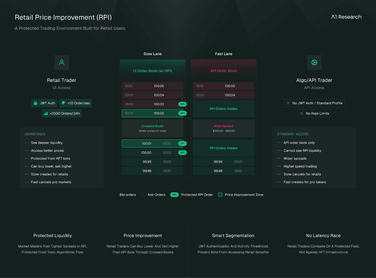 Market Maker Incentives: Because market makers know RPI flow is non-toxic (human traders, not bots), they can quote tighter spreads with larger size without fear of being picked off by faster participants.