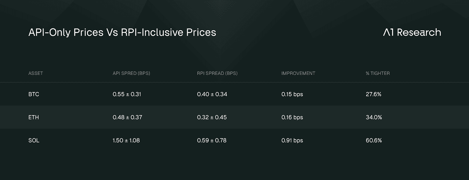 The improvement is substantial: retail UI traders receive spreads 28-61% tighter than API traders on the same platform. SOL shows the largest improvement, with RPI spreads less than half the API spread.
