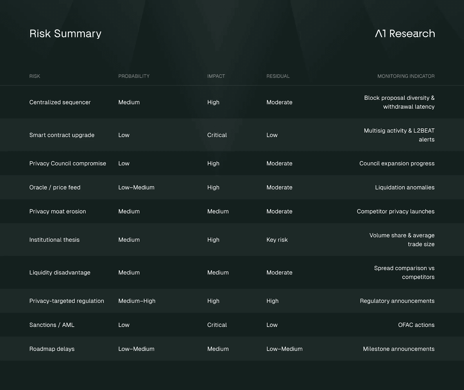 Execution risks relate to roadmap delivery. Key milestones lack public timelines: full cryptographic privacy, sequencer decentralization, Privacy Council expansion. However, 2025 execution was strong (Privacy Perps, Grinta upgrade, Stwo integration, RPI launch, Karnot council addition), suggesting the team can deliver.