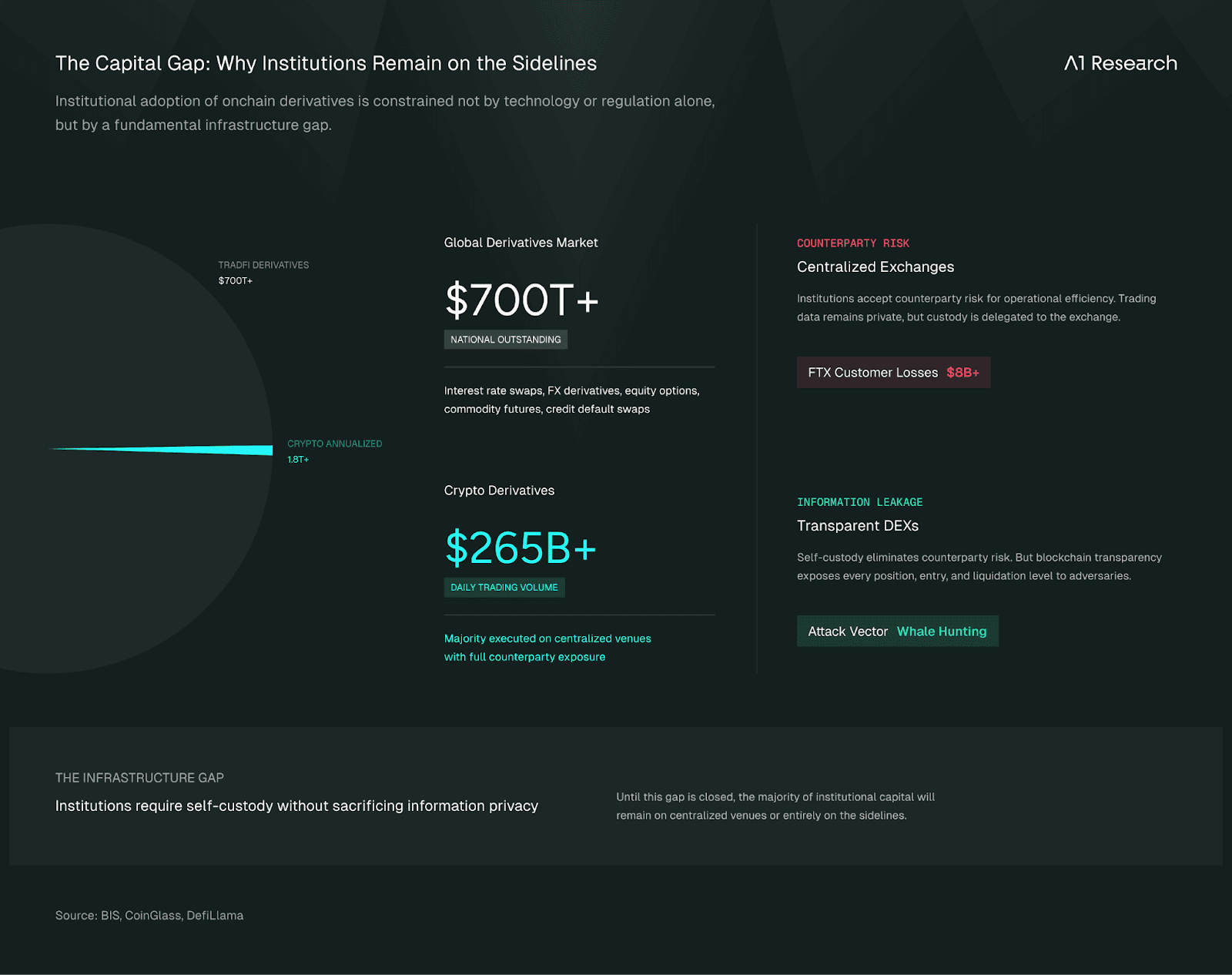 The global derivatives market represents over $700 trillion in notional outstanding value. Meanwhile, crypto derivatives process approximately $265 billion in daily volume, but the vast majority occurs on centralized venues. Institutional allocation to crypto assets is growing but remains constrained by infrastructure gaps, with privacy being among the most critical.