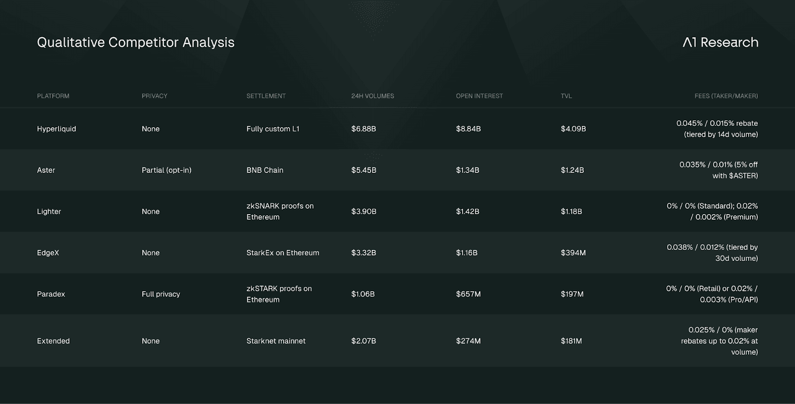 Fee structure differentiation. Only two platforms in the top tier operate with zero fees: Paradex and Lighter. Both settle to Ethereum via ZK proofs. Lighter offers verifiable matching but no position privacy, making it a potential competitor to monitor. It currently still has higher volume ($3.9B vs $1.06B), but Paradex has been catching up, and has a strong differentiator on its side (privacy).