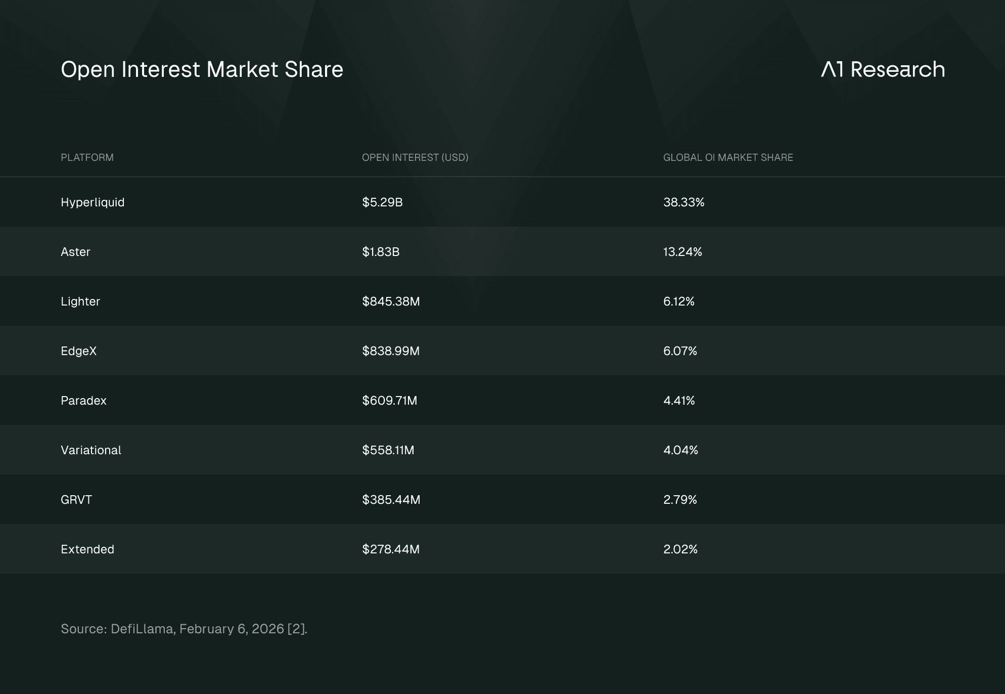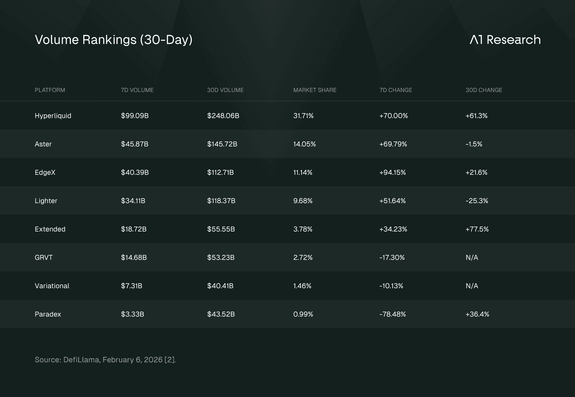 The result was fragmentation, and it was healthy fragmentation. Hyperliquid's market share compressed from approximately 80% in May 2025 to roughly 31% by February 2026. But this compression masked an important structural reality: Hyperliquid's absolute volume continued to grow throughout. What changed was that aggregate market growth, driven by Lighter, EdgeX, Extended, Aster, and others, outpaced any single platform's capture rate. The perp DEX market had entered a multi-venue era, and the institutional question shifted accordingly: not whether to access onchain derivatives, but which infrastructure to build on and route through.
