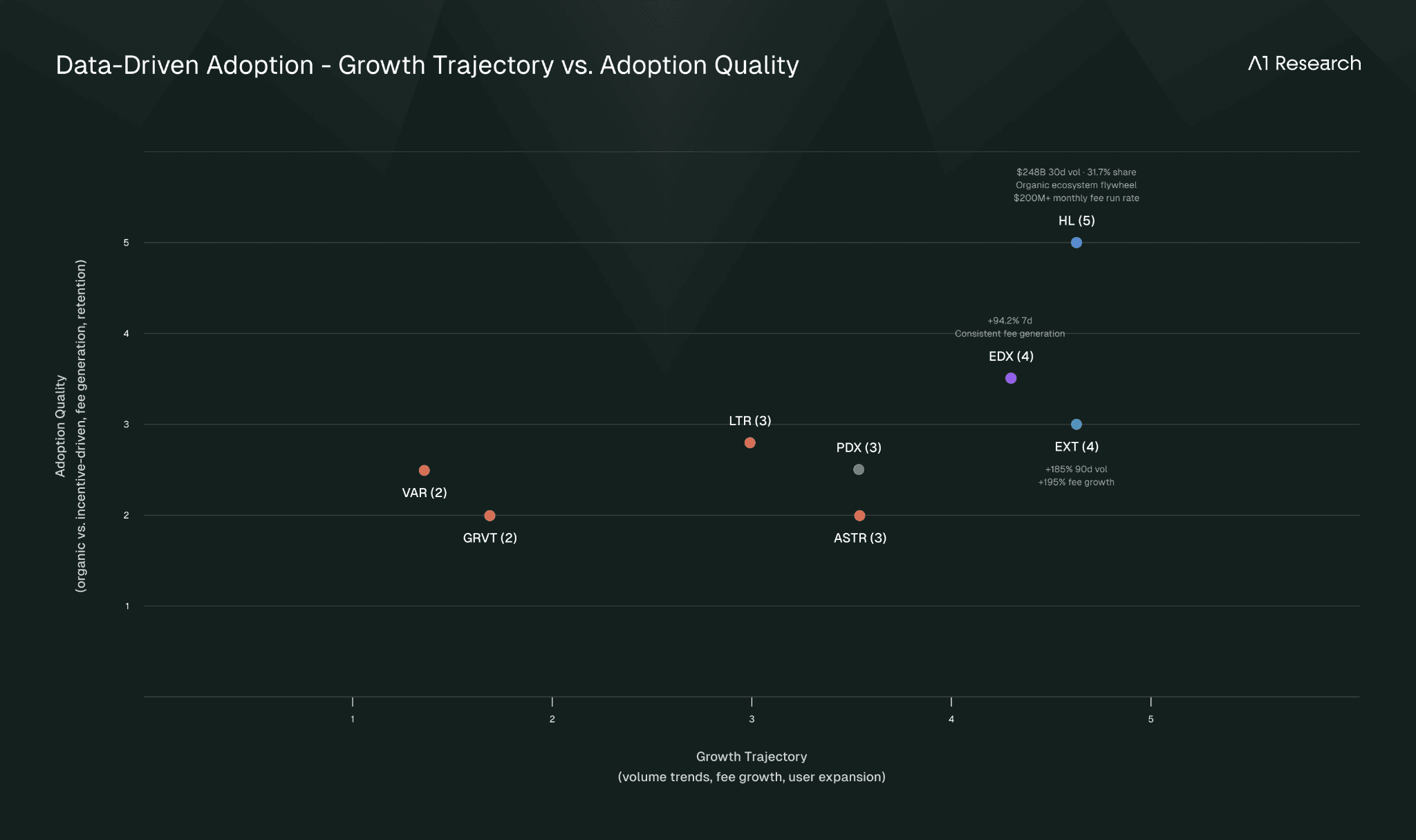 Lighter understood the problem at the cost layer, eliminating fees to attract flow and building the most aggressive bridge to TradFi asset classes via Chainlink's real-world data feeds, though the October outage (4.5 hours down, $50M in user impact) revealed that cost leadership means little without production resilience. Variational took the radical path of eliminating the orderbook entirely, offering zero-cost access through a single counterparty model. Extended and EdgeX are making architectural bets on margin infrastructure and modular execution that could leapfrog current leaders if delivered. GRVT is building the regulated on-ramp with institutional-grade vault management, sovereign ZK Chain privacy via Validium, and the most compliance-forward positioning in the cohort, betting that regulatory readiness and professional capital management will matter more than raw decentralization as institutional allocators enter the space. Aster, despite data credibility concerns, has demonstrated that multi-chain accessibility and broad asset coverage (including tokenized stocks and forex) can capture significant market share: its 14% volume share and second-largest OI position suggest that simplicity of access and product breadth matter to a large segment of the market, even if the platform lacks the architectural sophistication of its competitors.