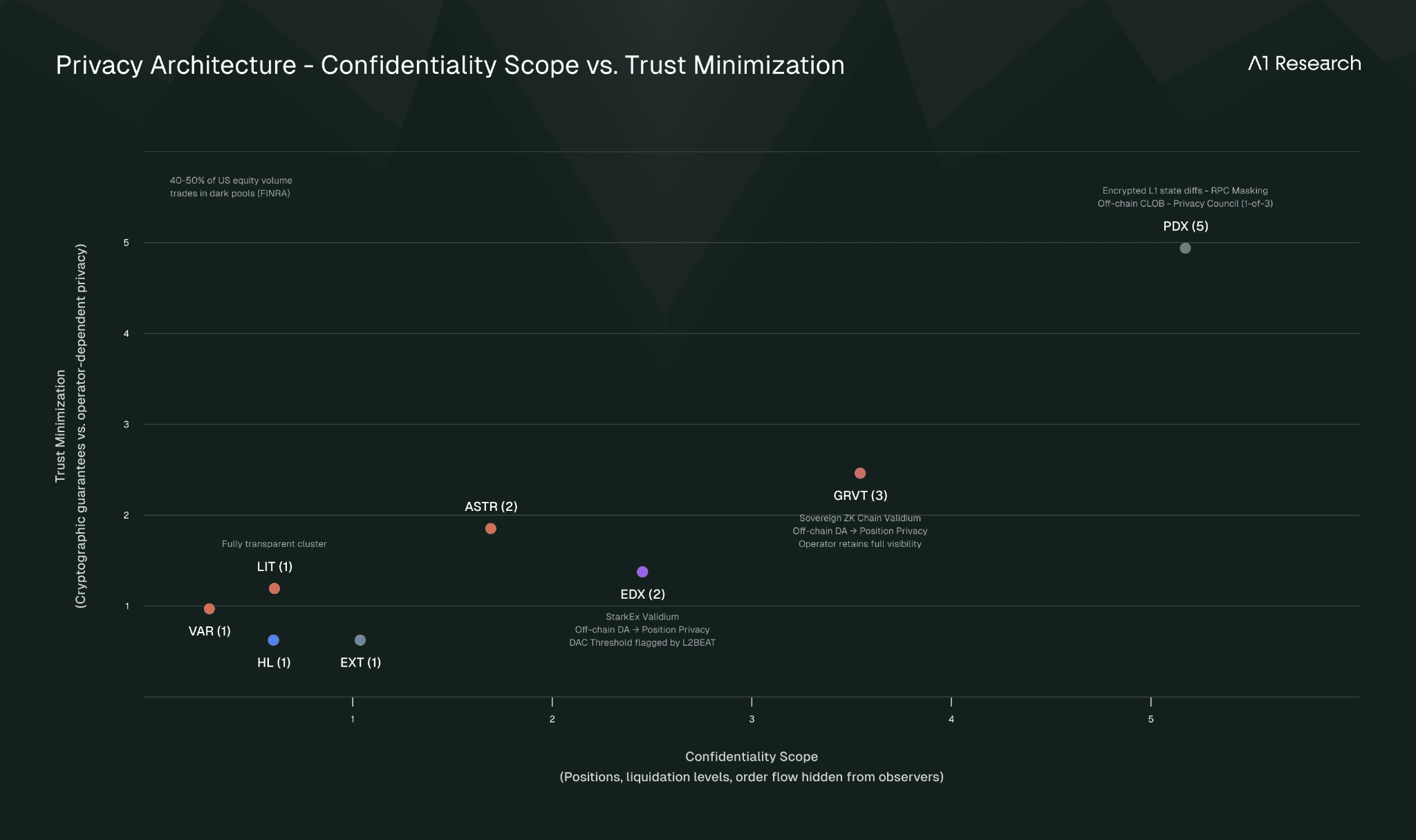 GRVT (40) is the most underappreciated platform relative to its institutional merits. Privacy at 3 reflects meaningful Validium-derived confidentiality (Section 4). Negative maker fees at all tiers and the four-layer Yield Flywheel (equity yield, negative maker fees, GLP returns at 11.4 Sharpe managed by ex-Optiver Ampersan team, referral incentives) represent the most comprehensive capital efficiency stack in the cohort. The Bermuda Class M license, Singapore Travel Rule compliance, and VASP status position GRVT uniquely for the regulatory landscape analyzed in Section 8. Settlement Security at 3 reflects the Validium DA trade-off: ZK proofs settle to Ethereum via ZKsync, but L2BEAT's findings on DA validator limitations and the EmergencyUpgradeBoard bypass prevent a higher score. The lower total reflects limited ecosystem depth, smaller liquidity base, and pre-TGE volume uncertainty.