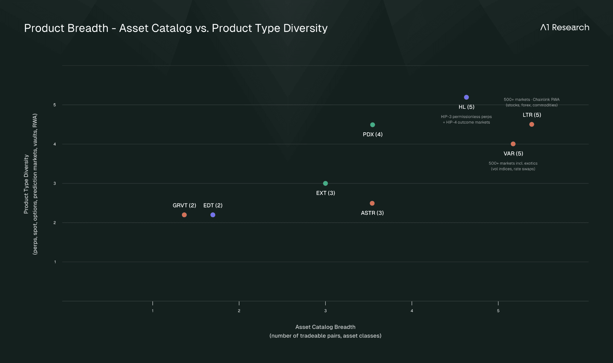 Lighter and Variational lead breadth at 500+ markets each. Lighter's Chainlink 24/5 U.S. Equities Streams integration (from January 2026) enables perpetual stocks, forex, and commodities, definitely one of the most concrete TradFi bridges in the cohort. Variational's automated Listing Engine onboards projects within hours of TGE (Eclipse listed 3 hours post-launch) and includes exotics like volatility indices and interest rate swaps. Paradex lists 250+ markets and is the first DEX with both perps and perpetual options fully onchain. Hyperliquid offers hundreds of markets too with HIP-3 enabling a rapid, permissionless expansion. EdgeX covers 100+ pairs including TradFi markets, while GRVT, Aster and Extended are in a similar range.