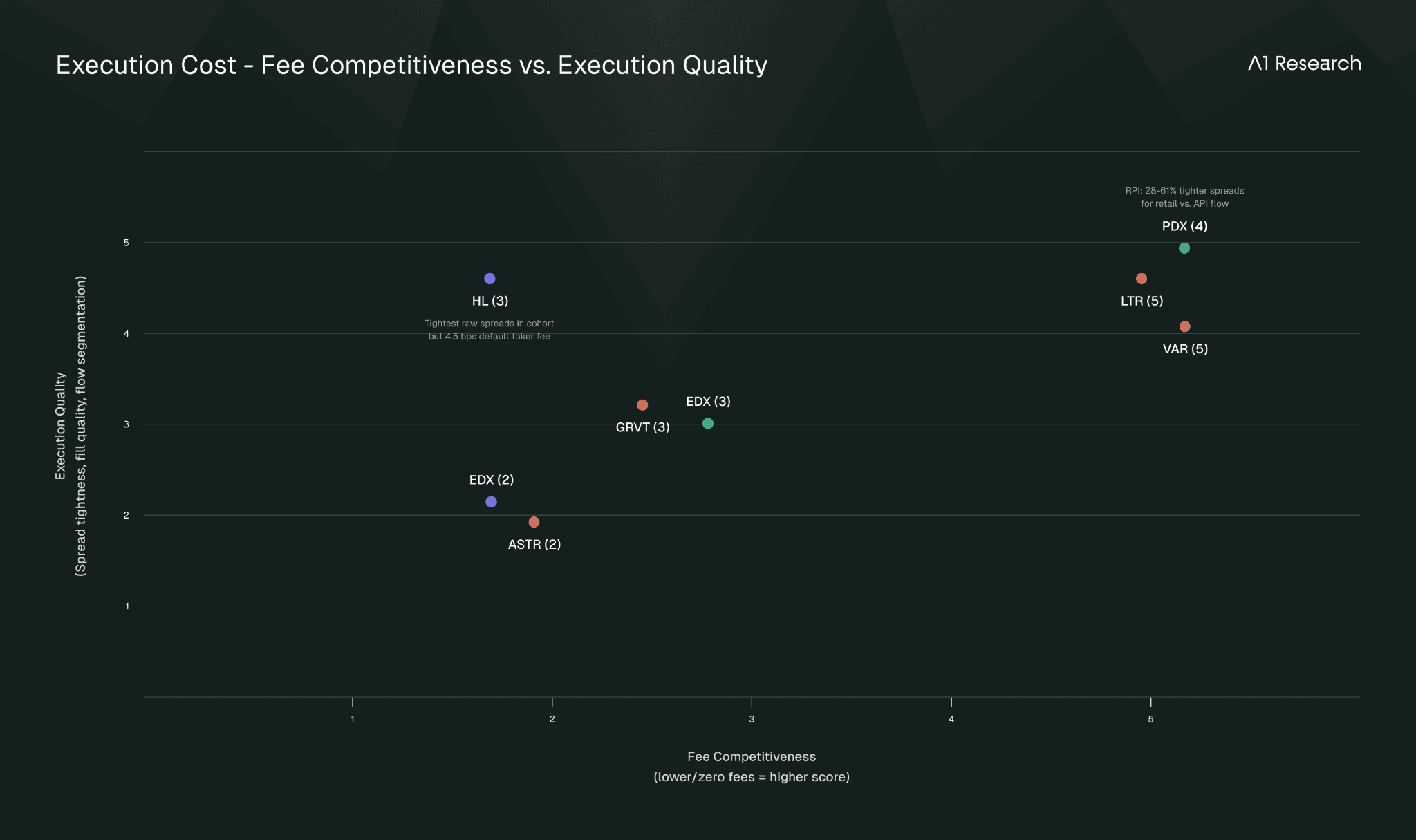 The latency advantage problem, where co-located or faster participants systematically extract value from slower market makers, is addressed differently across platforms. Paradex's sequencer-level flow segmentation acts as an implicit speed bump: retail flow is separated before it reaches the main orderbook, eliminating the latency race entirely for that flow category. Hyperliquid's fully onchain orderbook means all participants compete on the same infrastructure with no segmentation, which produces tight raw spreads through aggressive maker rebates but exposes all order flow to the same latency dynamics. GRVT and EdgeX operate off-chain matching engines with on-chain settlement, where the operator controls matching priority but without explicit flow segmentation mechanisms. Variational sidesteps the problem entirely through its RFQ model: there is no orderbook to front-run, but the OLP as sole counterparty must price in its own hedging latency risk.
