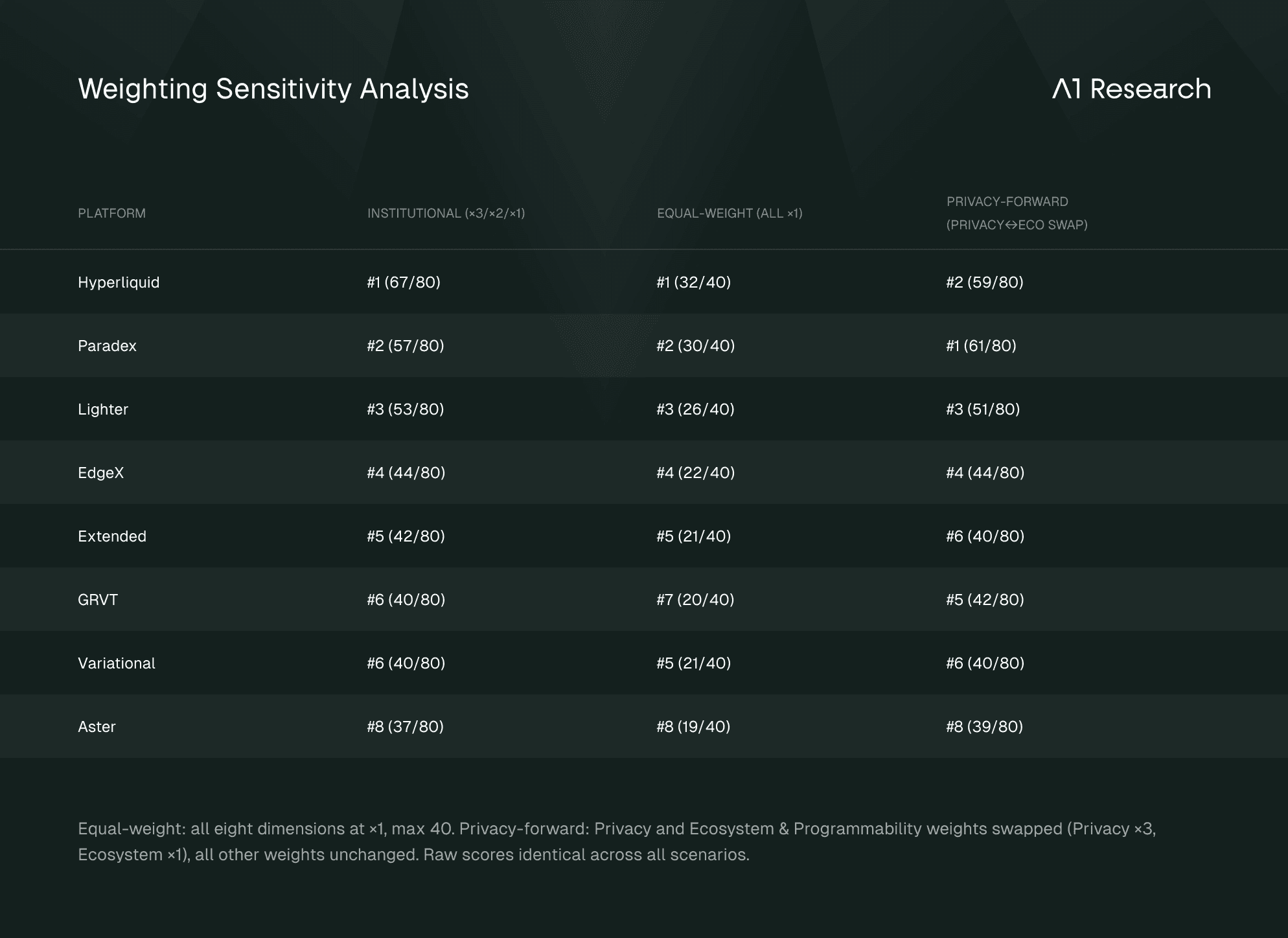 The key finding: the top three (Hyperliquid, Paradex, Lighter) hold across all scenarios, confirming rank stability at the top of the cohort. The most significant sensitivity is at #1-#2: under a privacy-forward weighting, Paradex overtakes Hyperliquid (61 vs 59), driven entirely by the 4-point privacy differential (5 vs 1) amplified at ×3. GRVT rises from #6 to #5 under privacy-forward weighting, consistent with its Validium-derived confidentiality. The bottom tier is stable regardless of methodology.