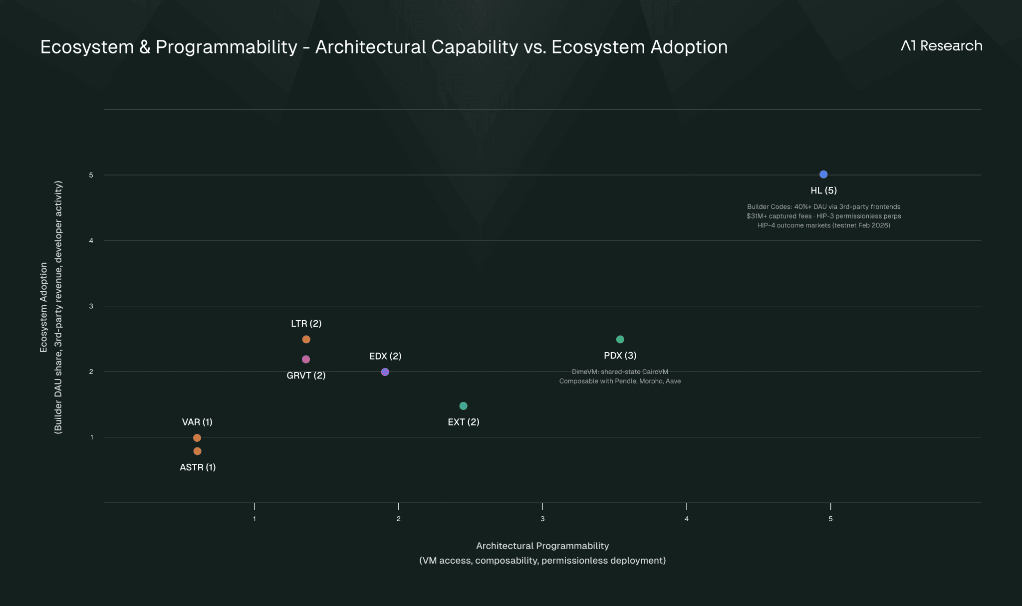 The programmability spectrum carries long-term defensibility implications. Hyperliquid's builder ecosystem at this point routes 40%+ of DAU through third-party frontends with $31M+ in captured fees; while most competitors have no programmability layer at all.