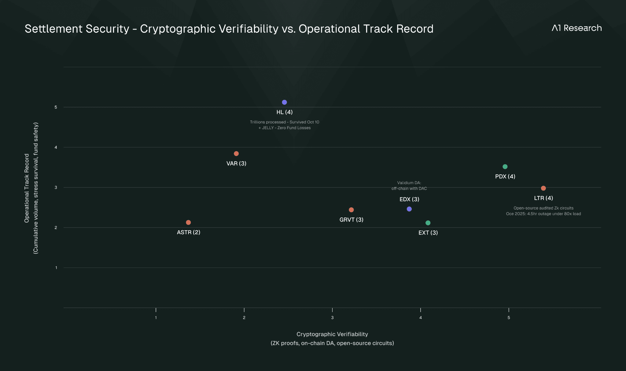 Settlement and Security. For institutional risk frameworks, the settlement layer determines ultimate recourse. ZK proofs (SNARKs/STARKs) to Ethereum (Paradex, Lighter, Extended) offer the strongest verifiability with onchain data availability. ZK proofs with Validium data availability (EdgeX) provide equivalent proof system strength but with off-chain DA trust assumptions. ZK proofs to Ethereum via ZKsync (GRVT) follow closely, inheriting Ethereum's security guarantees through validity proofs on settlement level despite the Validium data availability trade-off. Optimistic proofs via Arbitrum (Variational) provide weaker finality guarantees, dependent on a functioning verifier system. Hyperliquid's custom L1 consensus is strong, but has no Ethereum fallback, and Aster's guarantees vary by deployment chain and relies largely on offchain logic.