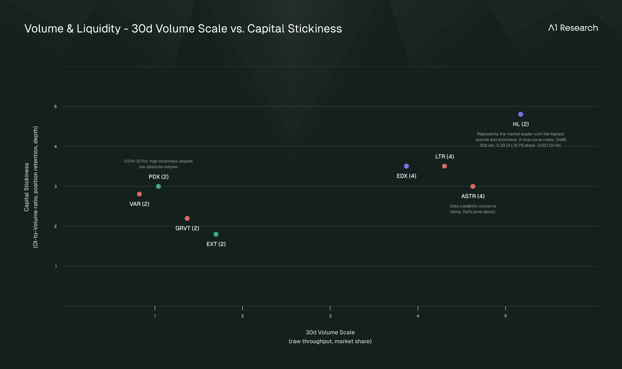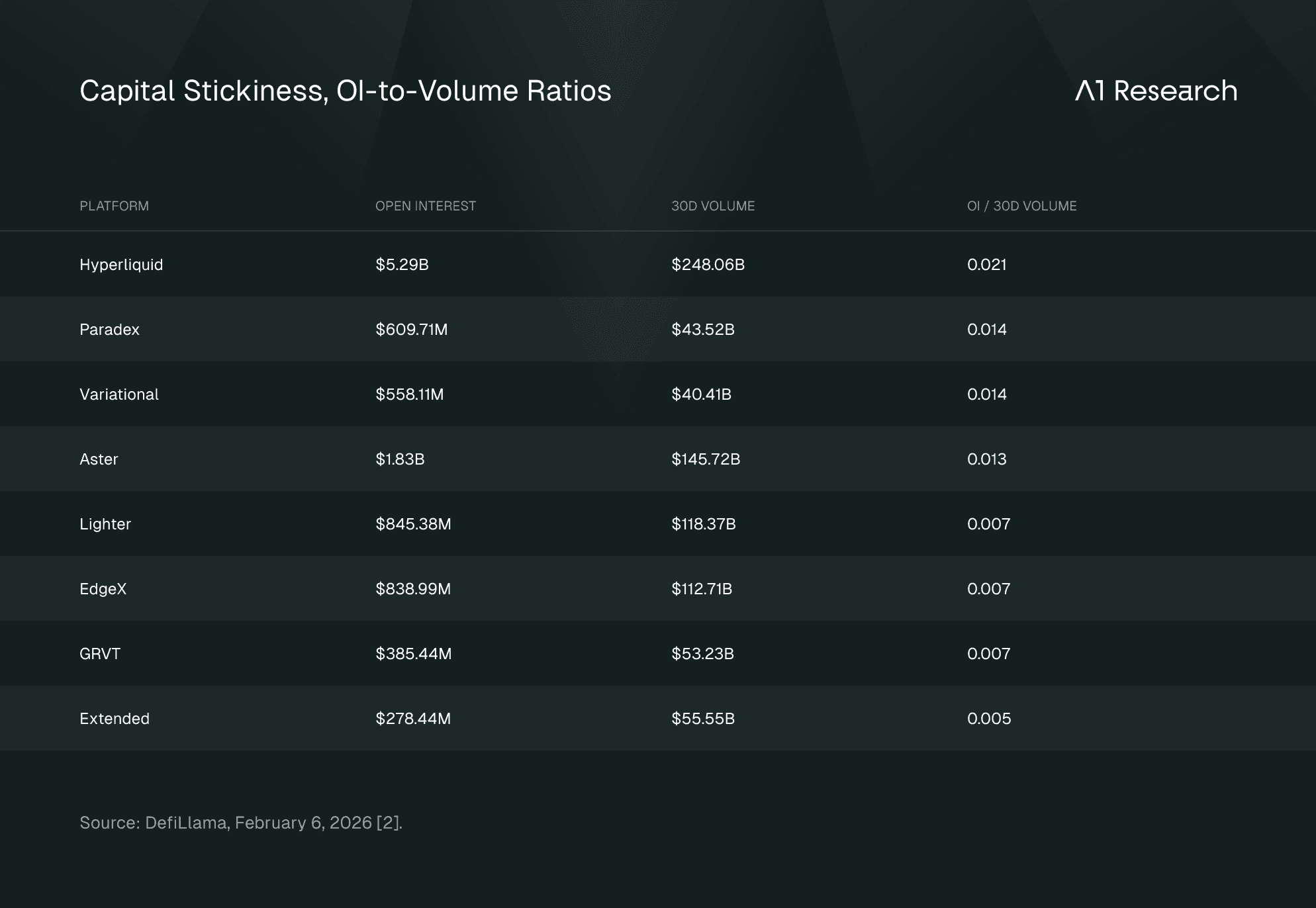 Capital stickiness separates real positioning from incentive churn. OI-to-30d-Volume ratios reveal a tiered market: Hyperliquid (0.021) leads by a wide margin, Paradex and Variational (both 0.014) form a second tier, while the bottom four cluster at 0.005-0.007.