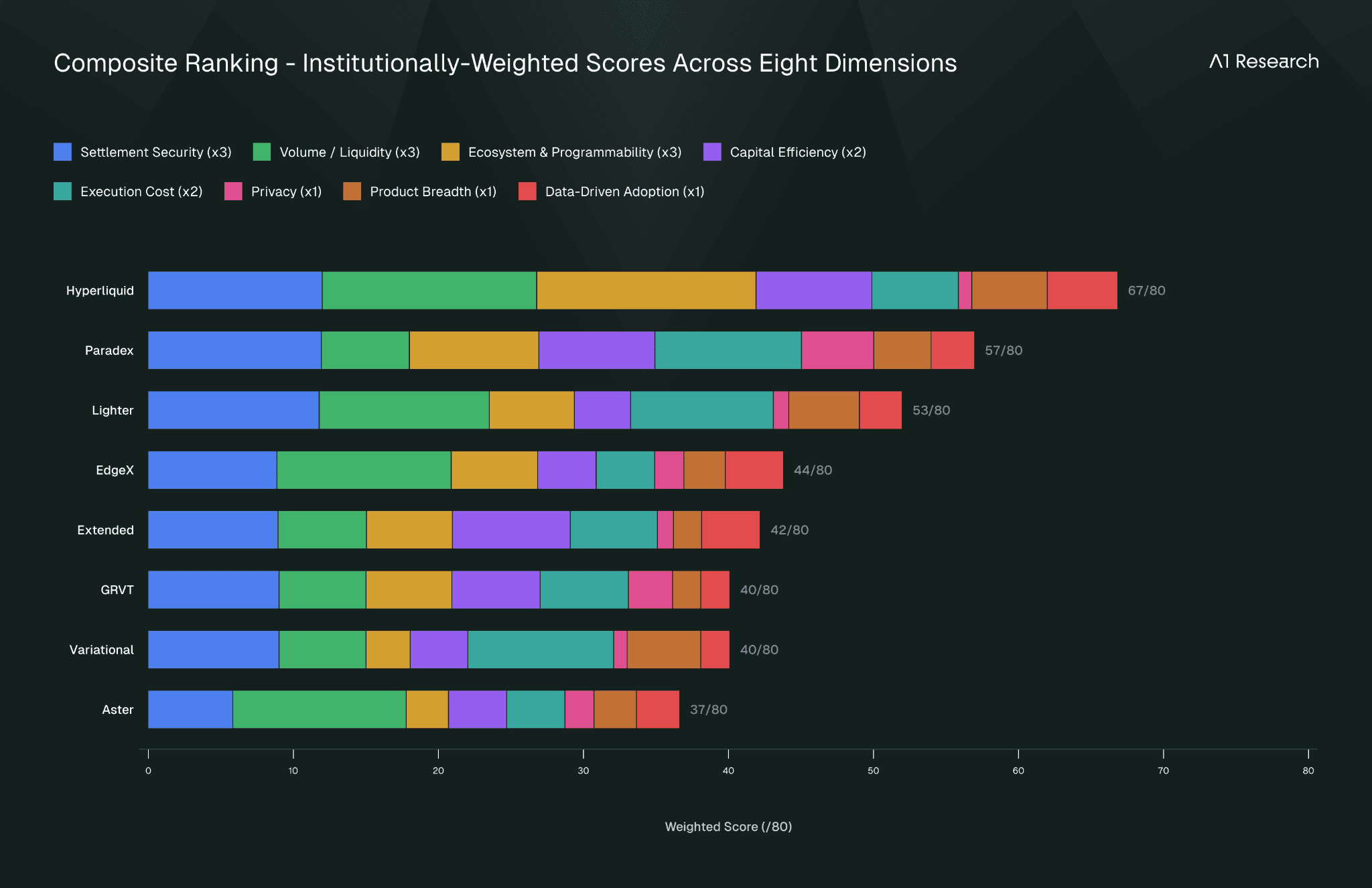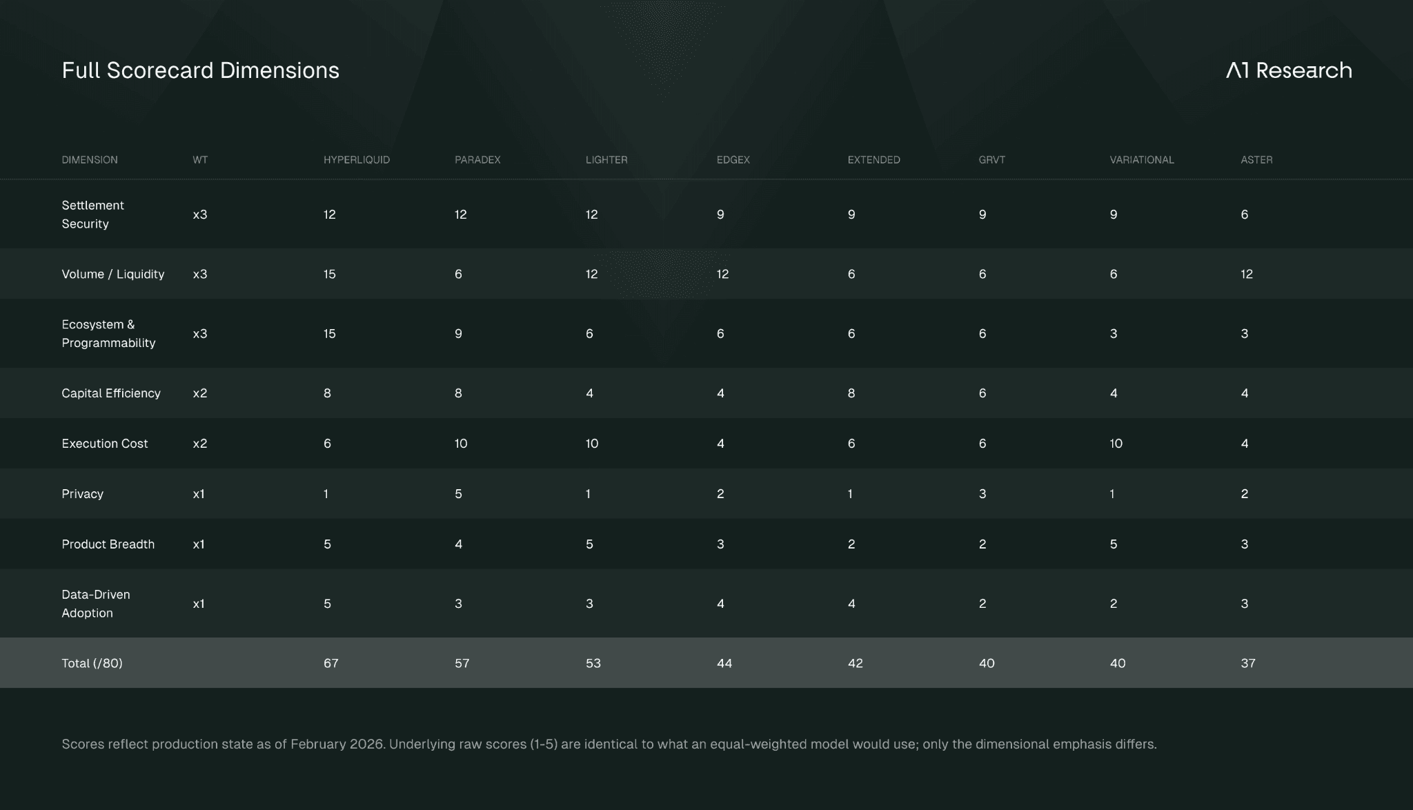 Data in this report reflects a snapshot taken on February 6, 2026. Volume and open interest figures are sourced from DefiLlama, which aggregates self-reported and on-chain data with known limitations around wash trading and incentive-driven activity. The scorecard in Section 9 uses institutionally-weighted scoring across eight dimensions, with three tiers of weighting (×3 for non-negotiable infrastructure, ×2 for core differentiators, ×1 for long-term considerations), scoring production capabilities only with no credit for roadmap items. Fee-adjusted execution cost analysis references our prior A1 Research orderbook study, which used 328 independent snapshots across seven platforms over January 13-16, 2026.